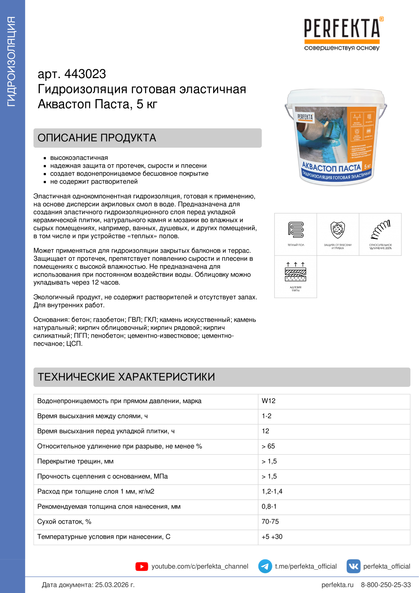 Все рекомендации и технические характеристики верны при температуре окружающей среды +20°С и относительной влажности 60%. Качество материала гарантируется только при точном соблюдении инструкции производителя по технологии применения и требований СНиП и СП. Данная инструкция теряет силу после появления новой версии на сайте perfekta.ru