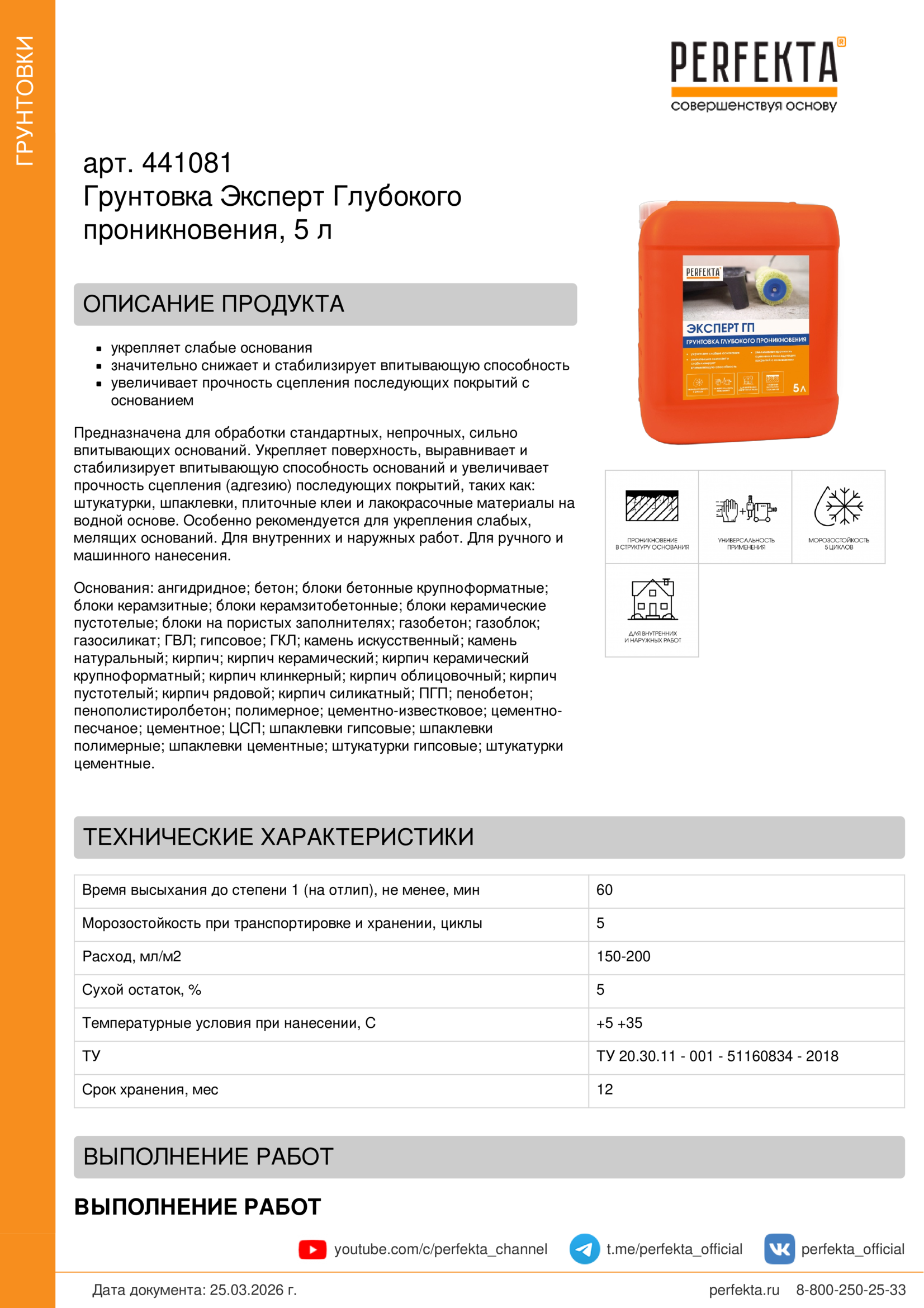 Все рекомендации и технические характеристики верны при температуре окружающей среды +20°С и относительной влажности 60 %. Качество материала гарантируется только при точном соблюдении инструкции производителя по технологии применения и требований СНиП и СП. Данная инструкция теряет силу после появления новой версии на сайте perfekta.ru.