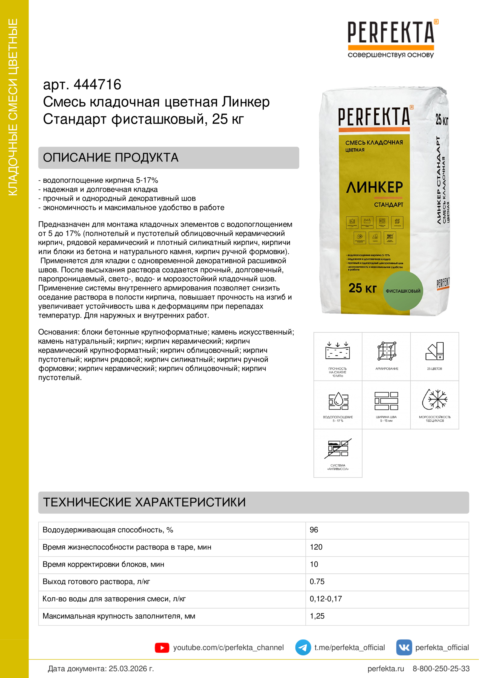 Предназначен для монтажа кладочных элементов с водопоглощением от 5 до 17% (полнотелый и пустотелый облицовочный керамический кирпич, рядовой керамический и плотный силикатный кирпич, кирпичи или блоки из бетона и натурального камня, кирпич ручной формовки).  Применяется для кладки с одновременной декоративной расшивкой швов. После высыхания раствора создается прочный, долговечный, паропроницаемый, свето-, водо- и морозостойкий кладочный шов. Применение системы внутреннего армирования позволяет снизить оседание раствора в полости кирпича, повышает прочность на изгиб и увеличивает устойчивость шва к деформациям при перепадах температур. Для наружных и внутренних работ.