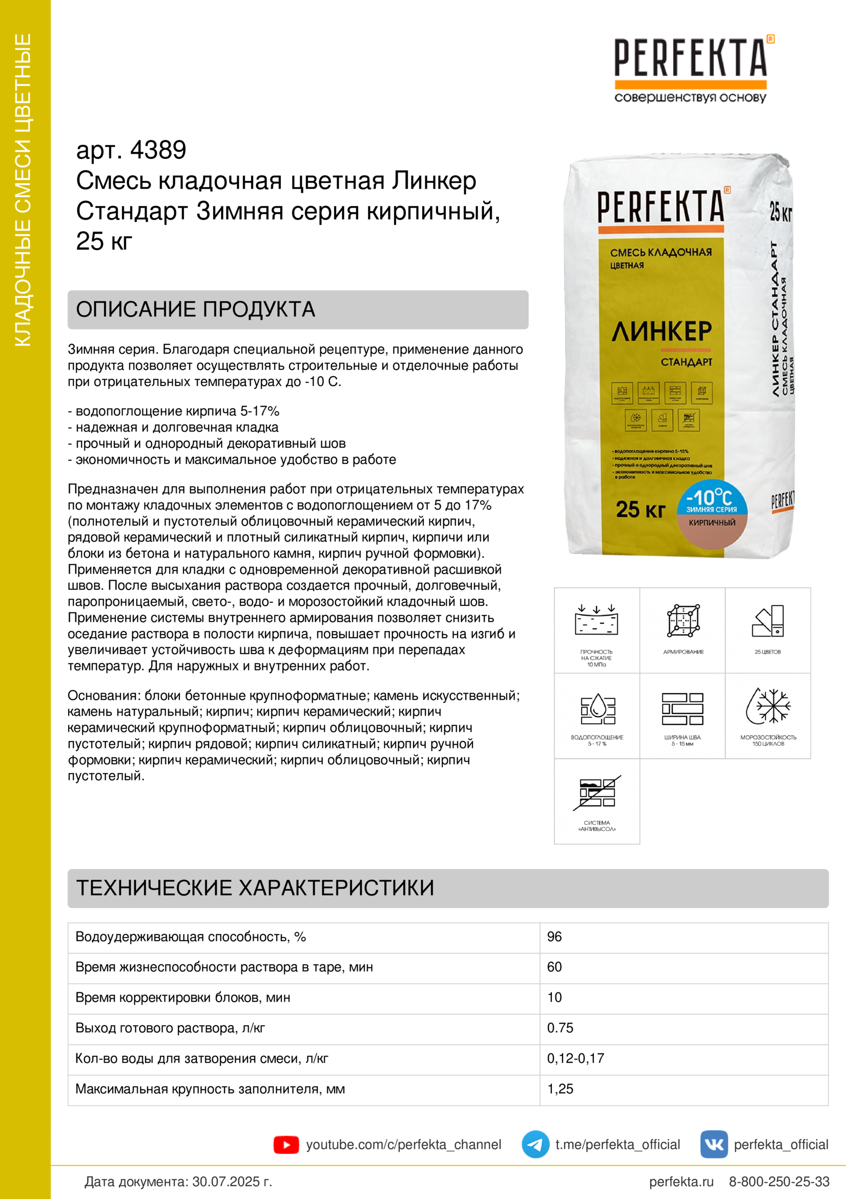 Предназначен для выполнения работ при отрицательных температурах по монтажу кладочных элементов с водопоглощением от 5 до 17% (полнотелый и пустотелый облицовочный керамический кирпич, рядовой керамический и плотный силикатный кирпич, кирпичи или блоки из бетона и натурального камня, кирпич ручной формовки).