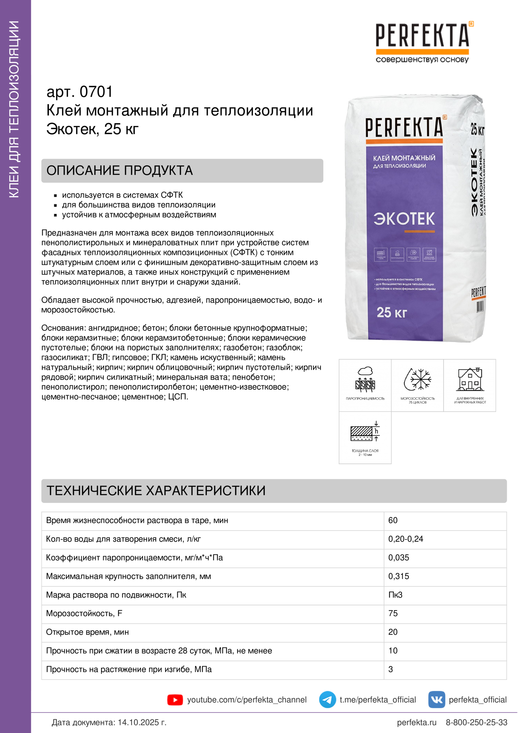 Все рекомендации и технические характеристики верны при температуре окружающей среды +20°С и относительной влажности 60 %. Качество материала гарантируется только при точном соблюдении инструкции производителя по технологии применения и требований СП 293.1325800.2017. Данная инструкция теряет силу после появления новой версии на сайте perfekta.ru.