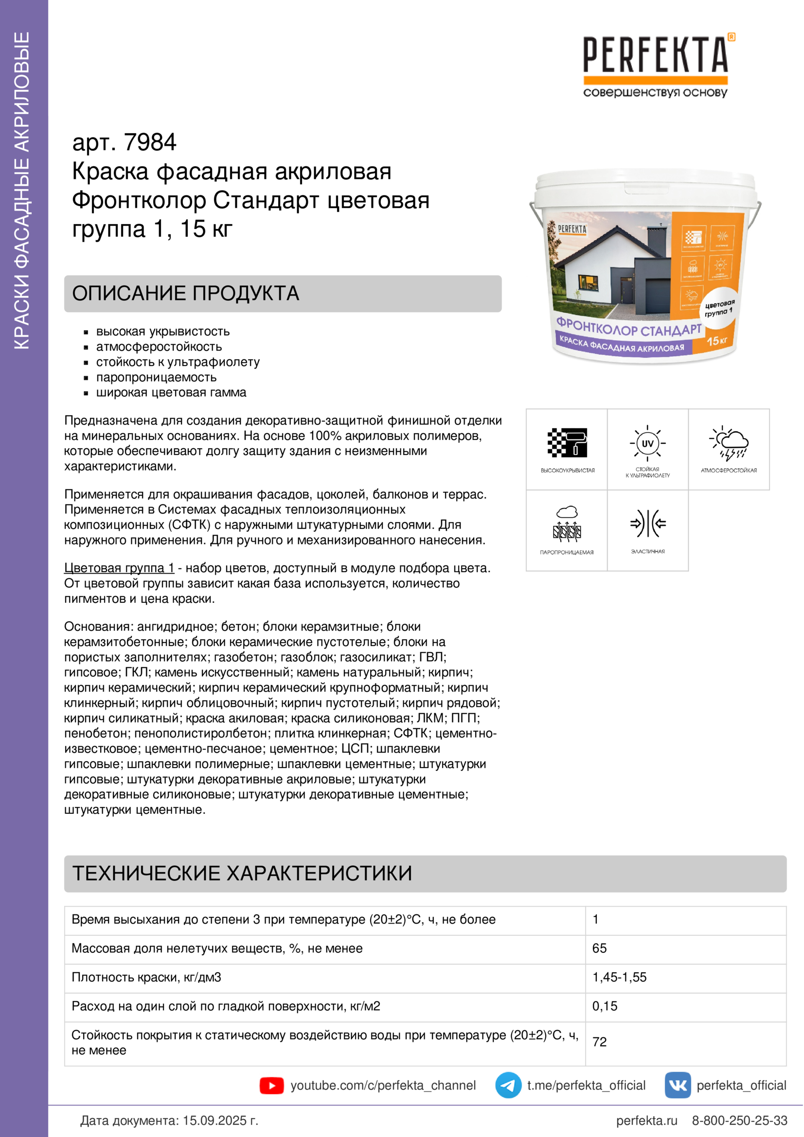 Краска фасадная акриловая Фронтколор Стандарт цветовая группа 1, 15 кг