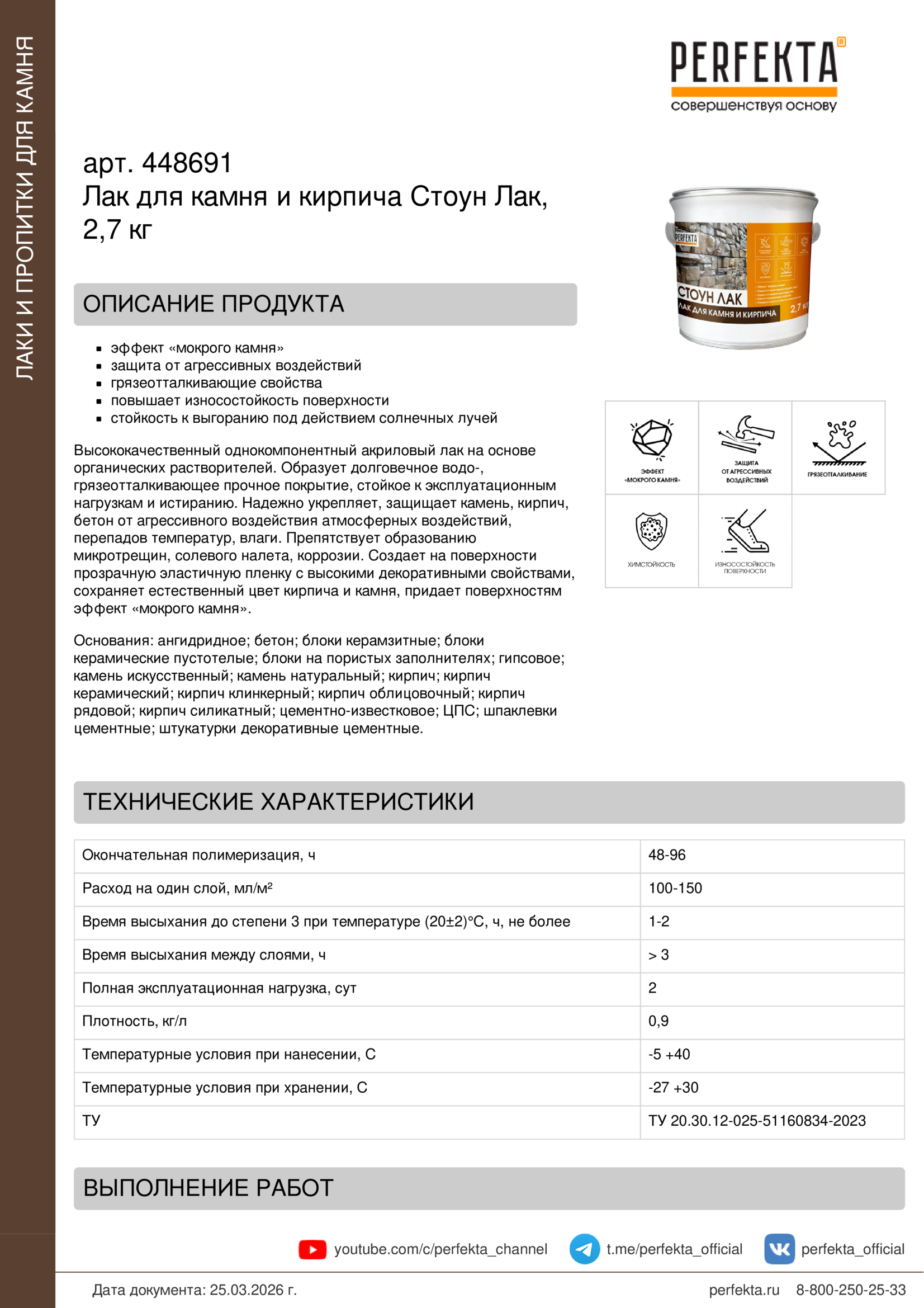 Высококачественный однокомпонентный акриловый лак на основе органических растворителей. Образует долговечное водо-, грязеотталкивающее прочное покрытие, стойкое к эксплуатационным нагрузкам и истиранию. Надежно укрепляет, защищает камень, кирпич, бетон от агрессивного воздействия атмосферных воздействий, перепадов температур, влаги. Препятствует образованию микротрещин, солевого налета, коррозии. Создает на поверхности прозрачную эластичную пленку с высокими декоративными свойствами, сохраняет естественный цвет кирпича и камня, придает поверхностям эффект «мокрого камня».