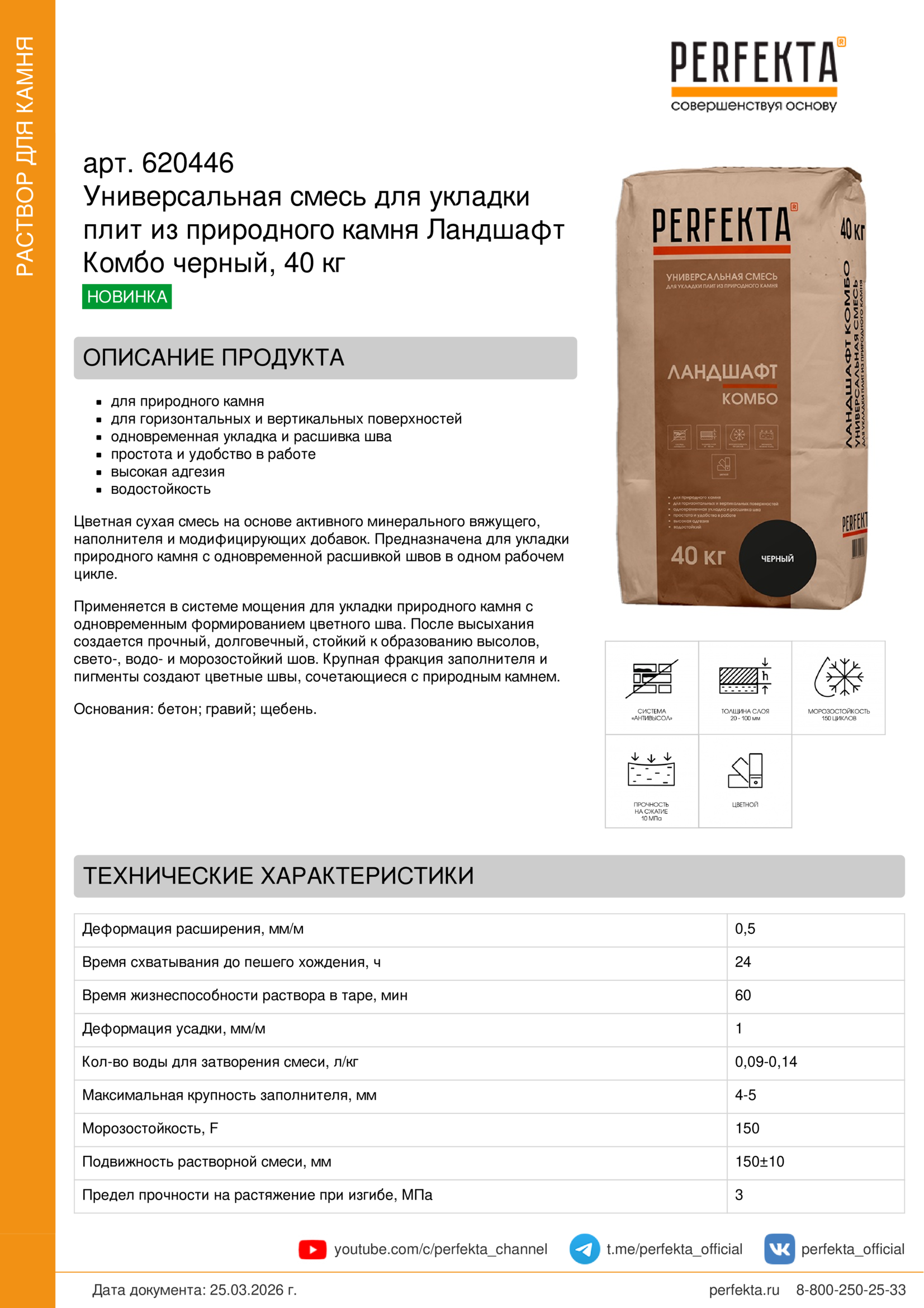 Цветная сухая смесь на основе активного минерального вяжущего, наполнителя и модифицирующих добавок. Предназначена для укладки природного камня с одновременной расшивкой швов в одном рабочем цикле.