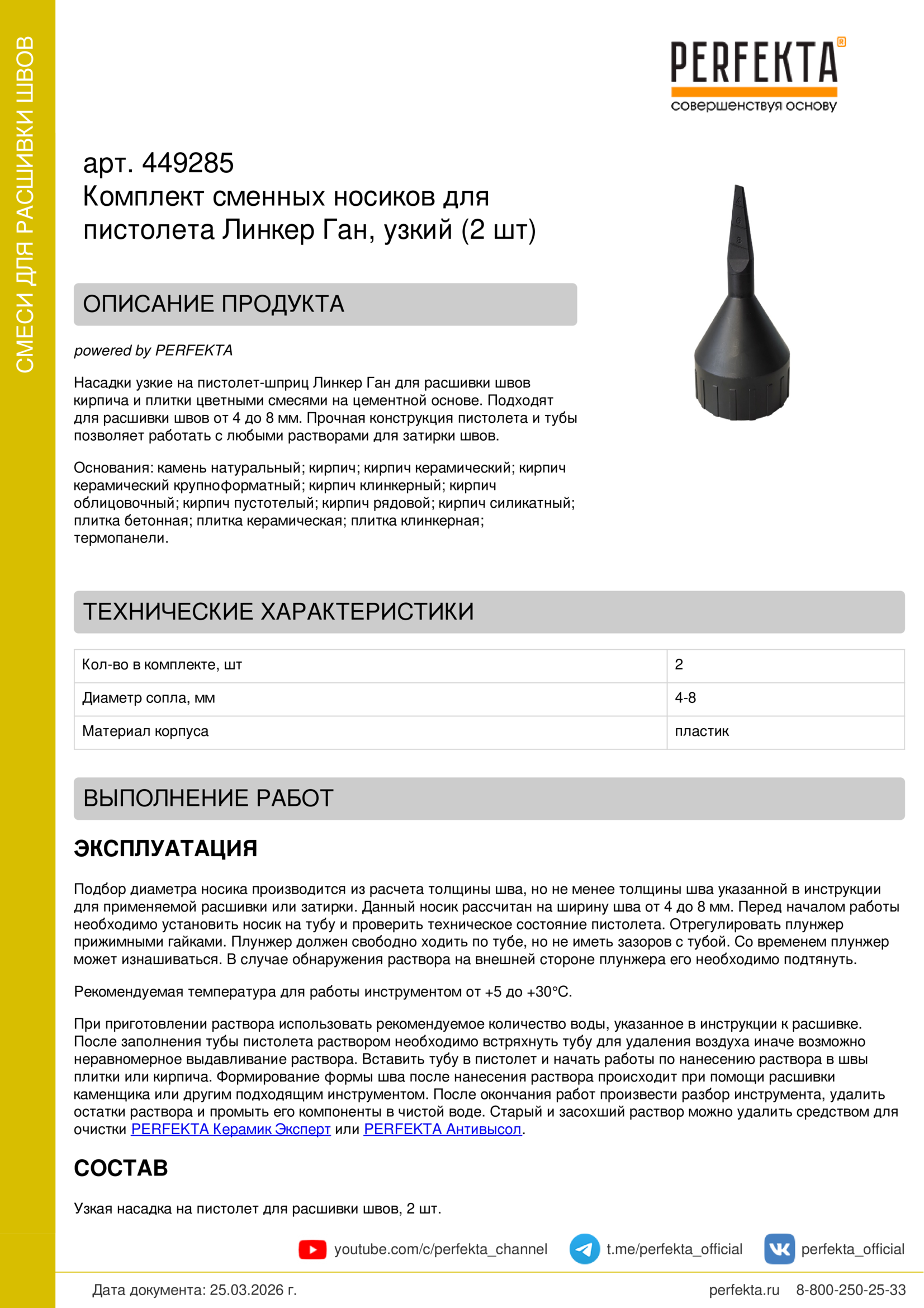 Насадки узкие на пистолет-шприц Линкер Ган для расшивки швов кирпича и плитки цветными смесями на цементной основе. Подходят для расшивки швов от 4 до 8 мм. Прочная конструкция пистолета и тубы позволяет работать с любыми растворами для затирки швов.