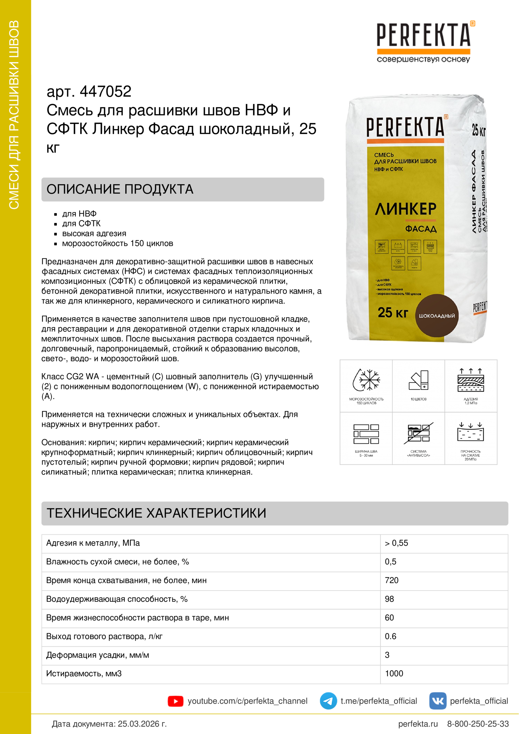 Для получения идеального результата рекомендуется дополнительная защита шва при помощи гидрофобизатора PERFEKTA Линкер Аквабарьер. Работы допускается производить при температуре воздуха и кладочных элементов не ниже +5 С и не выше +30 С. Свежеуложенную кладку и швы необходимо защищать от воздействия повышенных температур, осадков, сквозняков, попадания прямых солнечных лучей и мороза в течение 5-7 дней. Защиту следует производить с помощью накрывания пленкой, но при этом обеспечивать проветривание во избежание образования конденсата под пленкой.