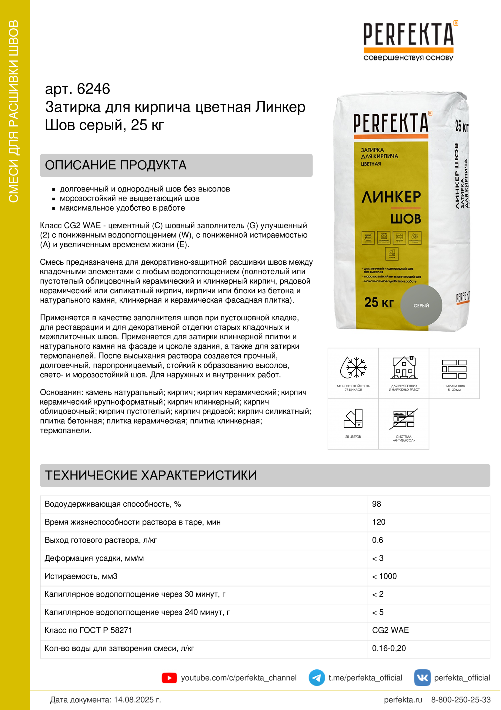 Полусухое применение: Уложить небольшое количество приготовленного раствора на поверхность расшивочного подноса и приложить край подноса к шву. Затем с помощью узкого шпателя нанести раствор в два приема, по методу «свежее по свежему» и распределить в него раствор равномерным слоем по поверхности. Декоративная расшивка шва при этом возможна одновременно с нанесением раствора. Свежеуложенные швы необходимо защищать от воздействия повышенных температур, осадков, сквозняков, попадания прямых солнечных лучей и мороза. После полного высыхания раствора в шве, обычно через 24 часа, необходимо удалить остатки материала из шва и лицевой поверхности кирпича, при помощи сухой мягкой щетки или кисти. Для получения идеального результата рекомендуется дополнительная защита шва при помощи гидрофобизатора для кирпича и бетона PERFEKTA Линкер Аквабарьер. Работы допускается производить при температуре воздуха и кладочных элементов не ниже +5°С и не выше +30°С. Свежеуложенную кладку и швы необходимо защищать от воздействия повышенных температур, осадков, сквозняков, попадания прямых солнечных лучей и мороза в течение 5-7 дней. Защиту следует производить с помощью накрывания пленкой, но при этом обеспечивать проветривание во избежание образования конденсата под пленкой. Примечание: Оттенок шва затвердевшего материала может изменяться в зависимости от погодных условий, от способа применения на строительном объекте, а также от способа формирования шва. Для точного выбора цвета раствора, рекомендуется предварительное выполнение пробной кладки.