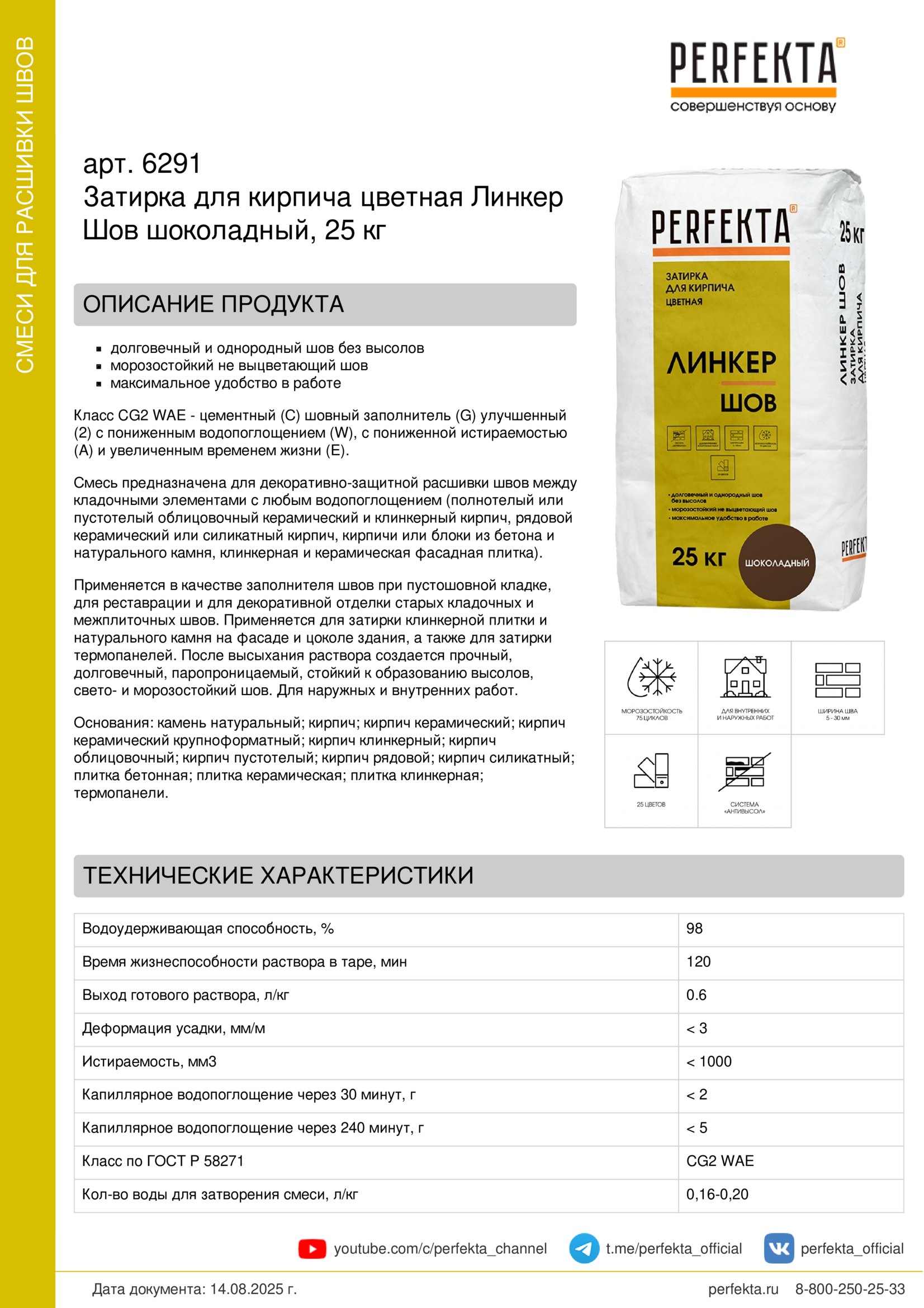 Полусухое применение: Уложить небольшое количество приготовленного раствора на поверхность расшивочного подноса и приложить край подноса к шву. Затем с помощью узкого шпателя нанести раствор в два приема, по методу «свежее по свежему» и распределить в него раствор равномерным слоем по поверхности. Декоративная расшивка шва при этом возможна одновременно с нанесением раствора. Свежеуложенные швы необходимо защищать от воздействия повышенных температур, осадков, сквозняков, попадания прямых солнечных лучей и мороза. После полного высыхания раствора в шве, обычно через 24 часа, необходимо удалить остатки материала из шва и лицевой поверхности кирпича, при помощи сухой мягкой щетки или кисти. Для получения идеального результата рекомендуется дополнительная защита шва при помощи гидрофобизатора для кирпича и бетона PERFEKTA Линкер Аквабарьер. Работы допускается производить при температуре воздуха и кладочных элементов не ниже +5°С и не выше +30°С. Свежеуложенную кладку и швы необходимо защищать от воздействия повышенных температур, осадков, сквозняков, попадания прямых солнечных лучей и мороза в течение 5-7 дней. Защиту следует производить с помощью накрывания пленкой, но при этом обеспечивать проветривание во избежание образования конденсата под пленкой. Примечание: Оттенок шва затвердевшего материала может изменяться в зависимости от погодных условий, от способа применения на строительном объекте, а также от способа формирования шва. Для точного выбора цвета раствора, рекомендуется предварительное выполнение пробной кладки.
