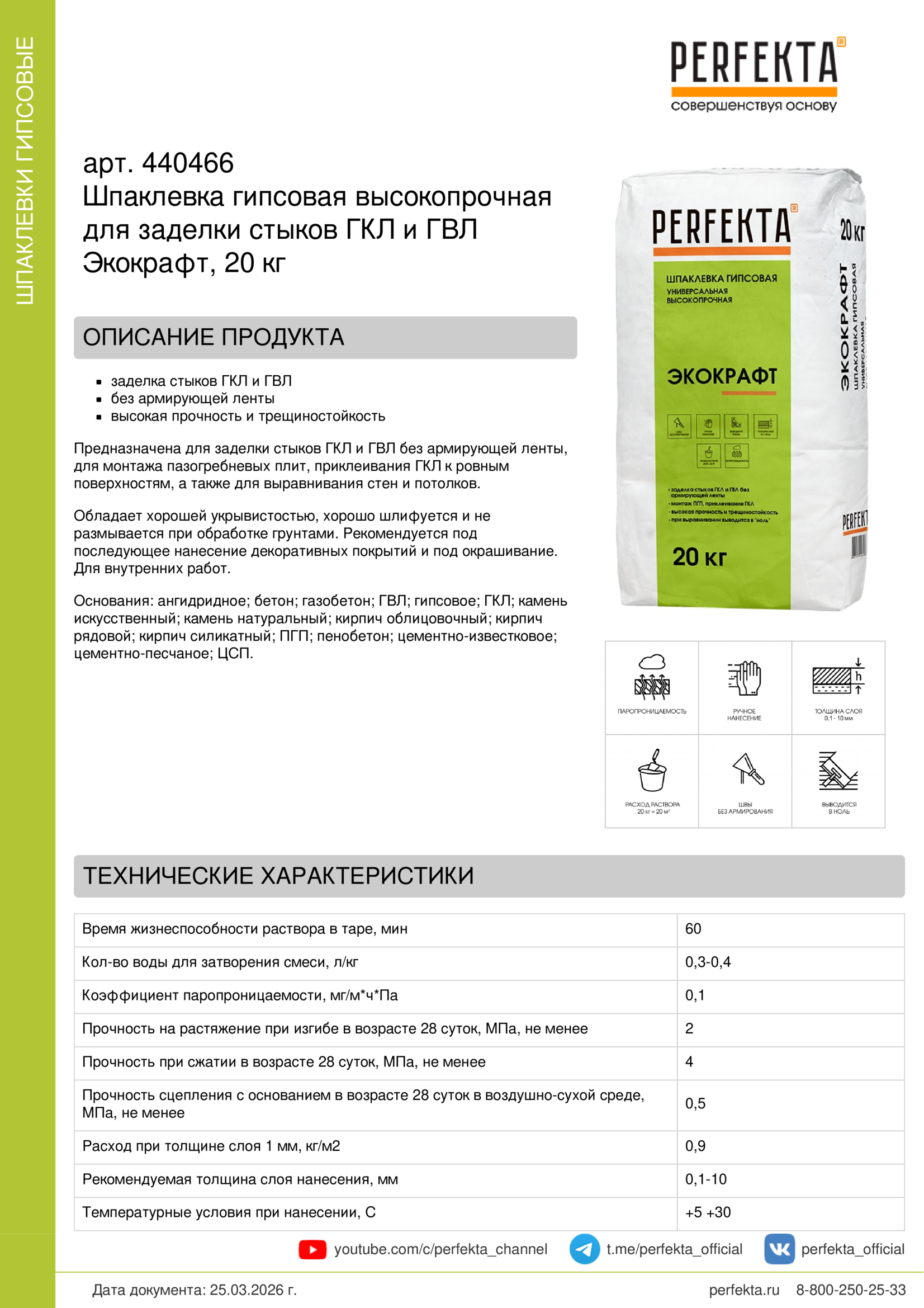 Шпаклевка гипсовая высокопрочная для заделки стыков ГКЛ и ГВЛ Экокрафт, 20 кг