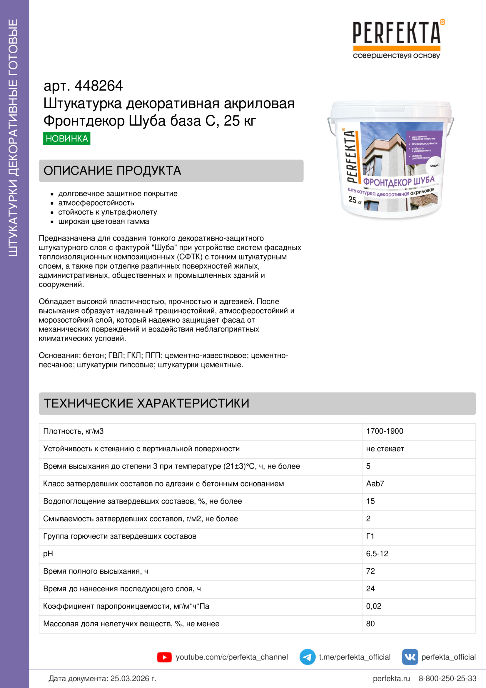 Обладает высокой пластичностью, прочностью и адгезией. После высыхания образует надежный трещиностойкий, атмосферостойкий и морозостойкий слой, который надежно защищает фасад от механических повреждений и воздействия неблагоприятных климатических условий.