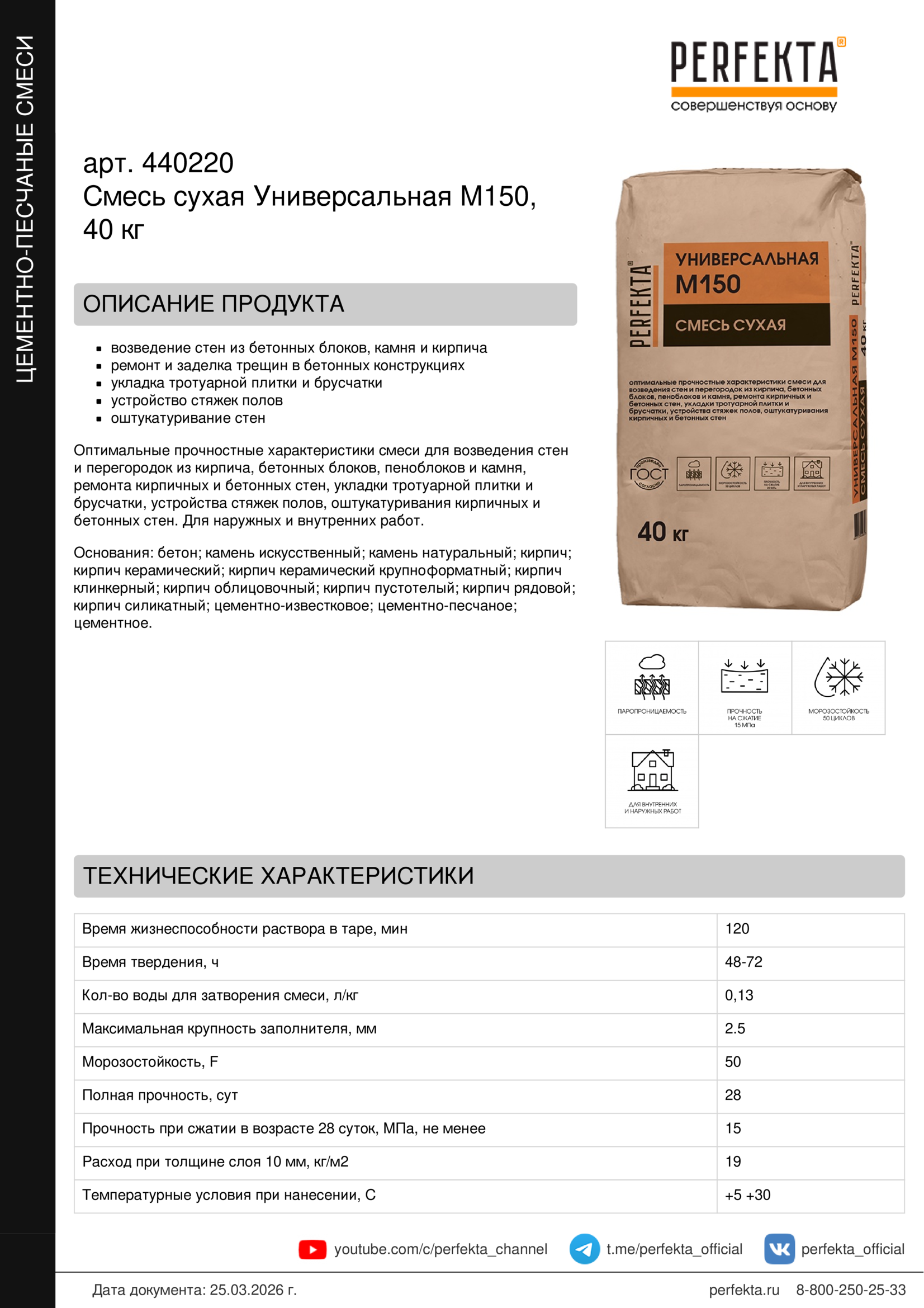 Оптимальные прочностные характеристики смеси для возведения стен и перегородок из кирпича, бетонных блоков, пеноблоков и камня, ремонта кирпичных и бетонных стен, укладки тротуарной плитки и брусчатки, устройства стяжек полов, оштукатуривания кирпичных и бетонных стен. Для наружных и внутренних работ.