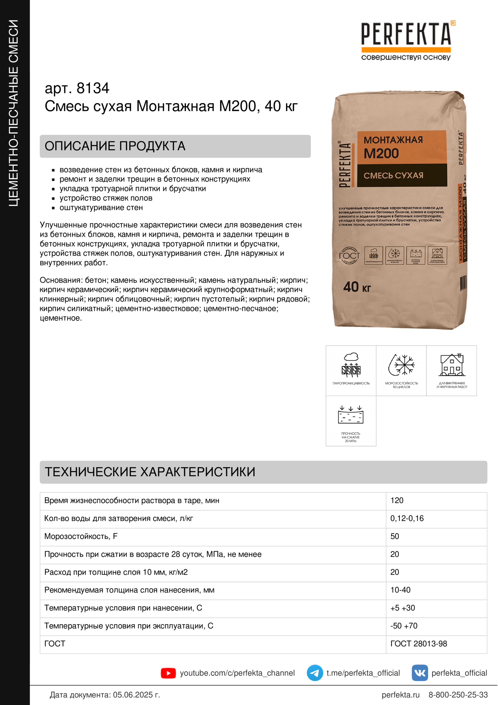 Улучшенные прочностные характеристики смеси для возведения стен из бетонных блоков, камня и кирпича, ремонта и заделки трещин в бетонных конструкциях, укладка тротуарной плитки и брусчатки, устройства стяжек полов, оштукатуривания стен. Для наружных и внутренних работ.