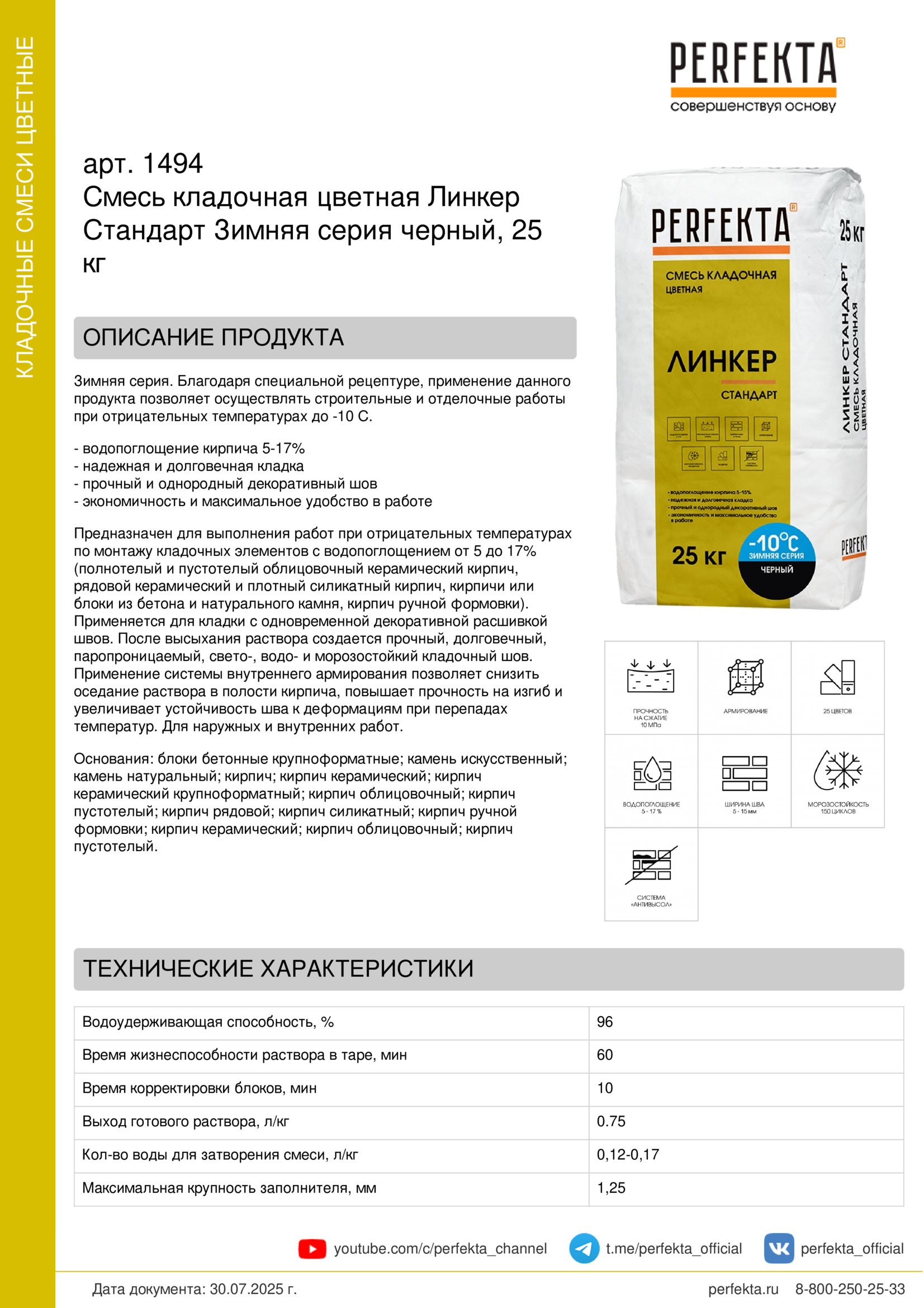 Предназначен для выполнения работ при отрицательных температурах по монтажу кладочных элементов с водопоглощением от 5 до 17% (полнотелый и пустотелый облицовочный керамический кирпич, рядовой керамический и плотный силикатный кирпич, кирпичи или блоки из бетона и натурального камня, кирпич ручной формовки).