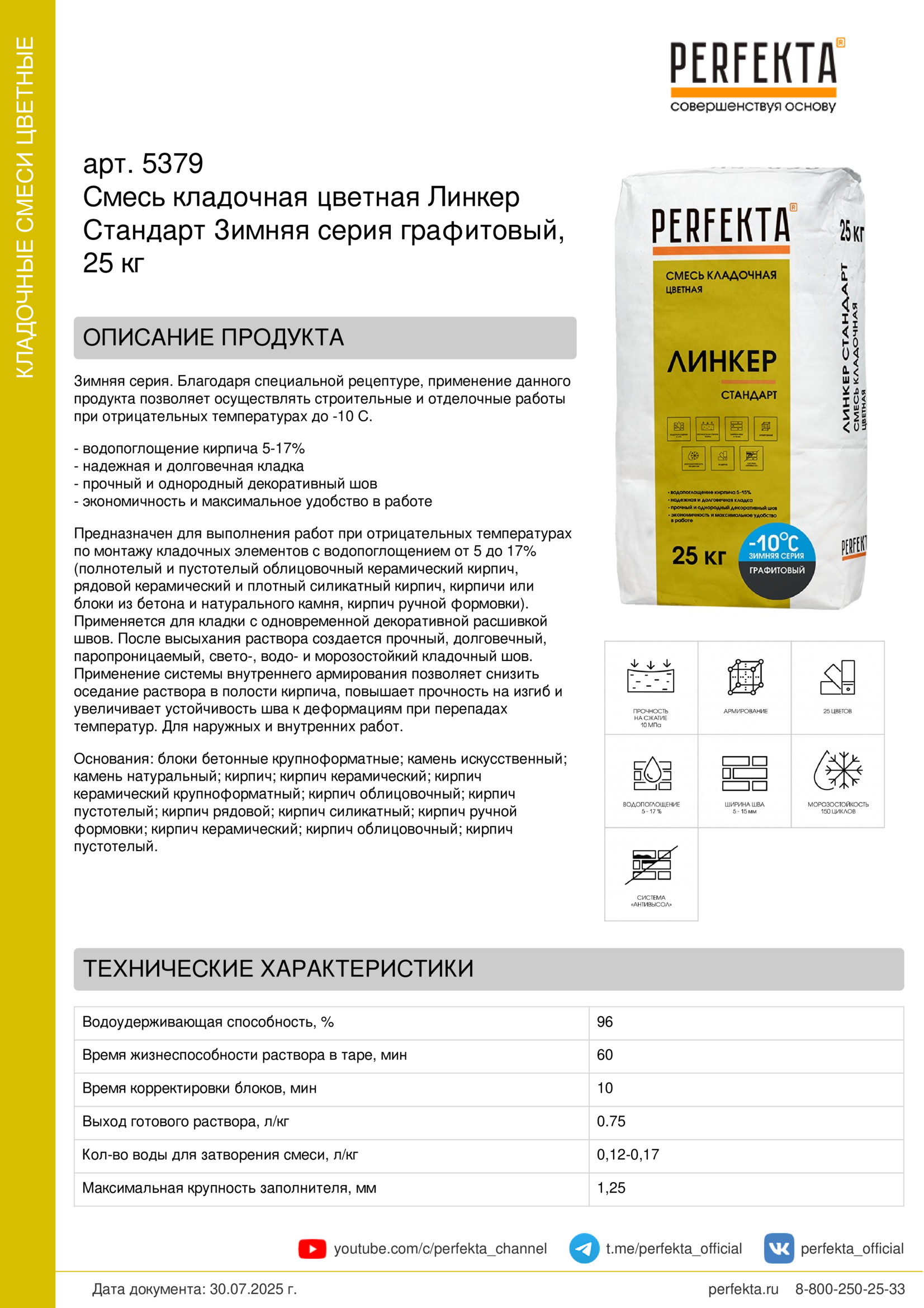 Предназначен для выполнения работ при отрицательных температурах по монтажу кладочных элементов с водопоглощением от 5 до 17% (полнотелый и пустотелый облицовочный керамический кирпич, рядовой керамический и плотный силикатный кирпич, кирпичи или блоки из бетона и натурального камня, кирпич ручной формовки).