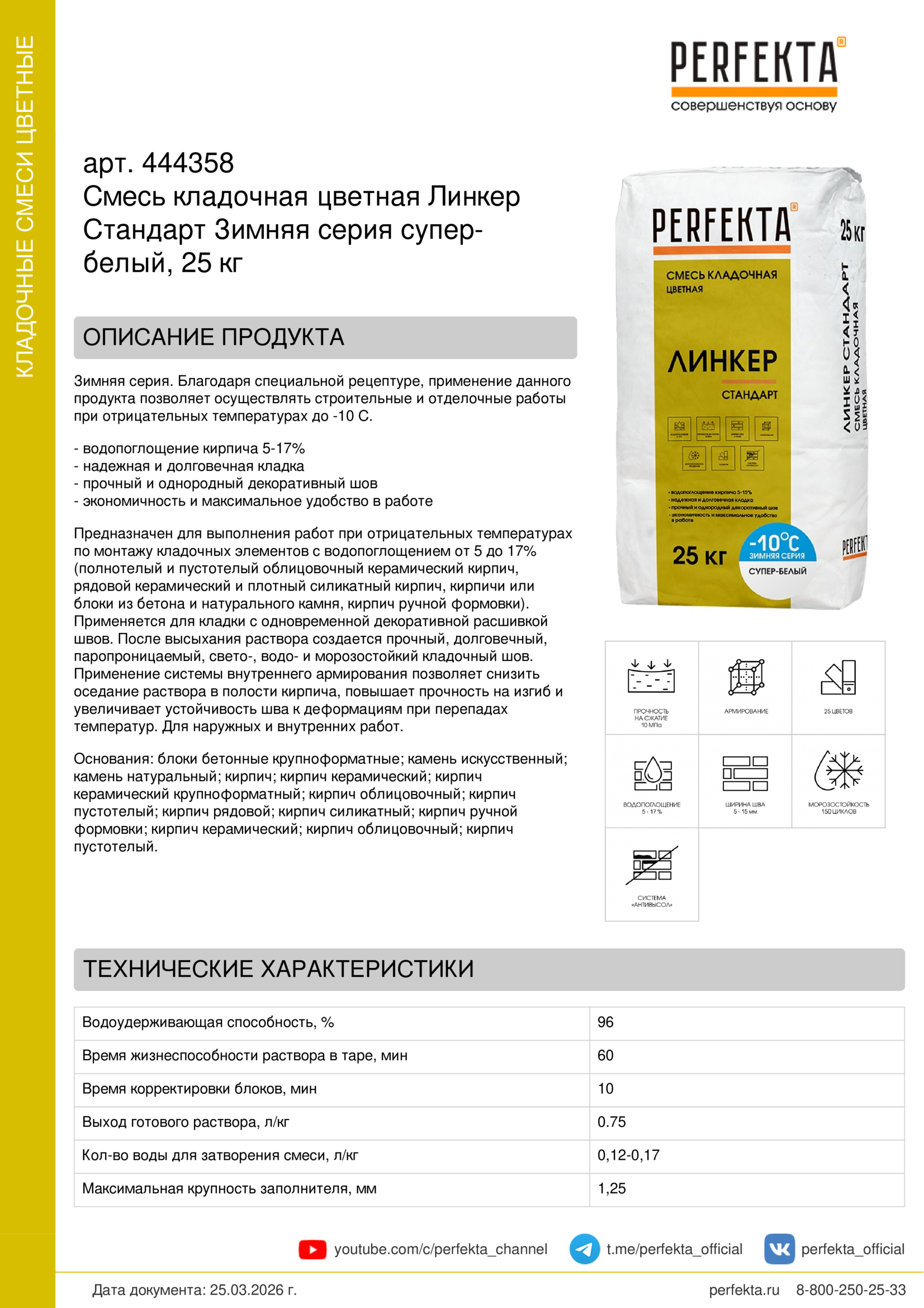 Зимняя серия. Благодаря специальной рецептуре, применение данного продукта позволяет осуществлять строительные и отделочные работы при отрицательных температурах до -10 С.