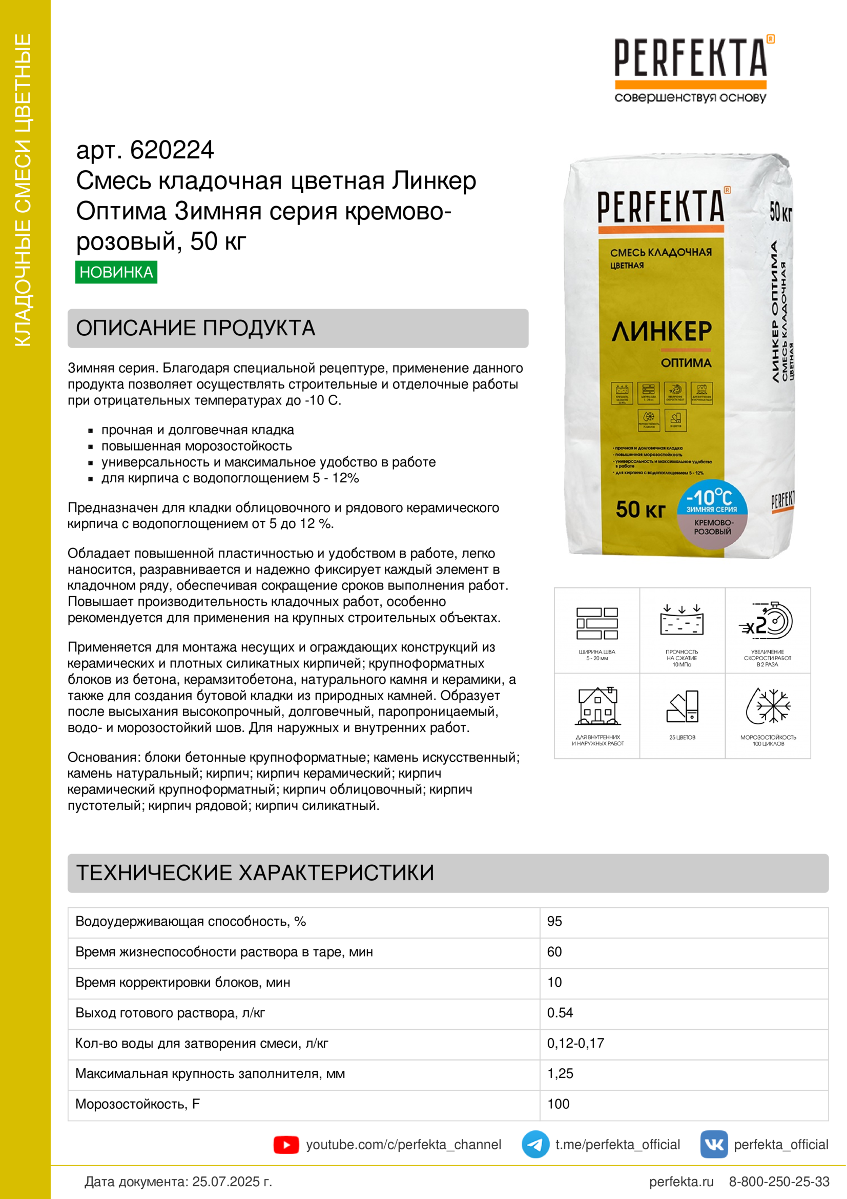Зимняя серия. Благодаря специальной рецептуре, применение данного продукта позволяет осуществлять строительные и отделочные работы при отрицательных температурах до -10 С.