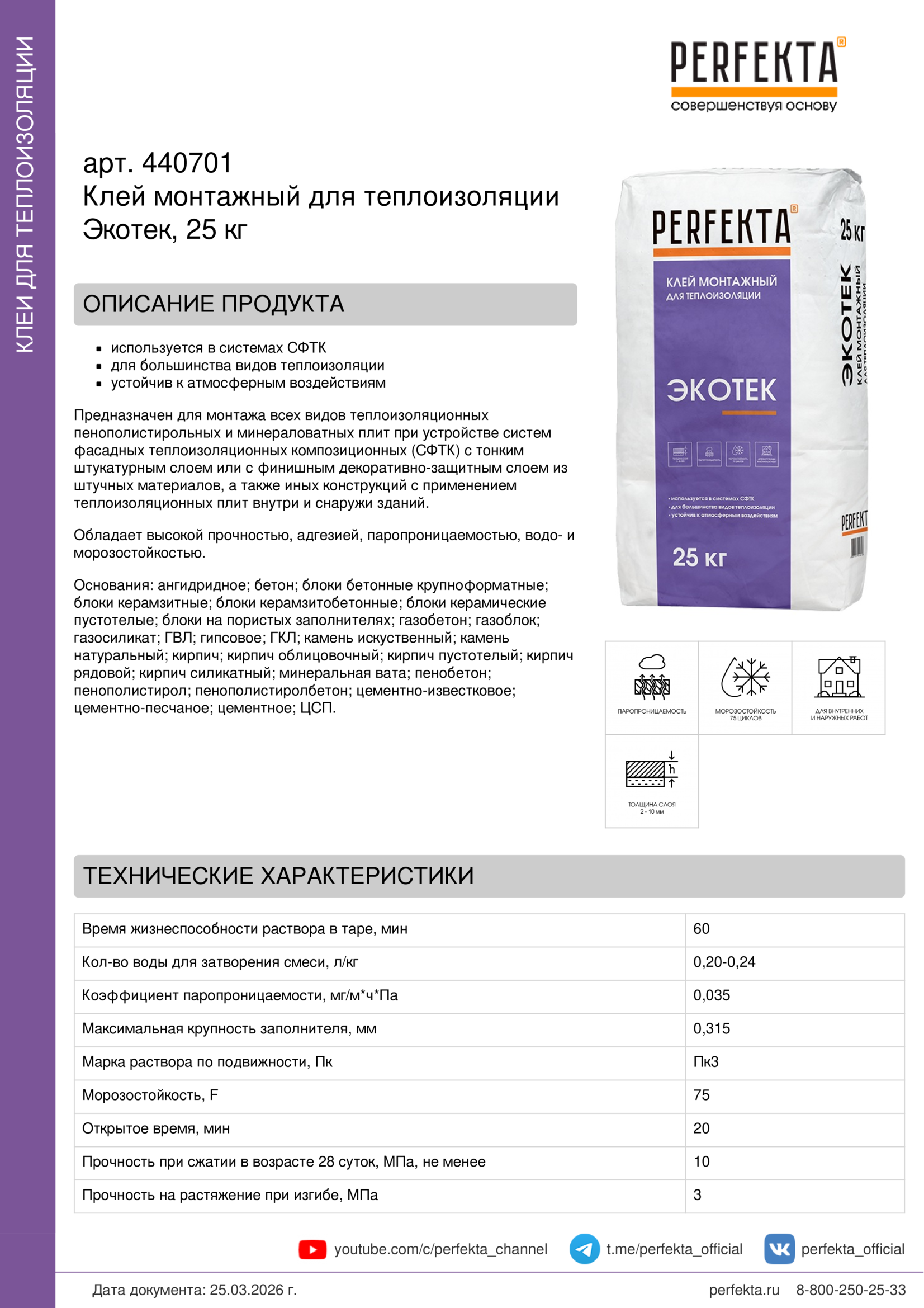 Все рекомендации и технические характеристики верны при температуре окружающей среды +20°С и относительной влажности 60 %. Качество материала гарантируется только при точном соблюдении инструкции производителя по технологии применения и требований СП 293.1325800.2017. Данная инструкция теряет силу после появления новой версии на сайте perfekta.ru.
