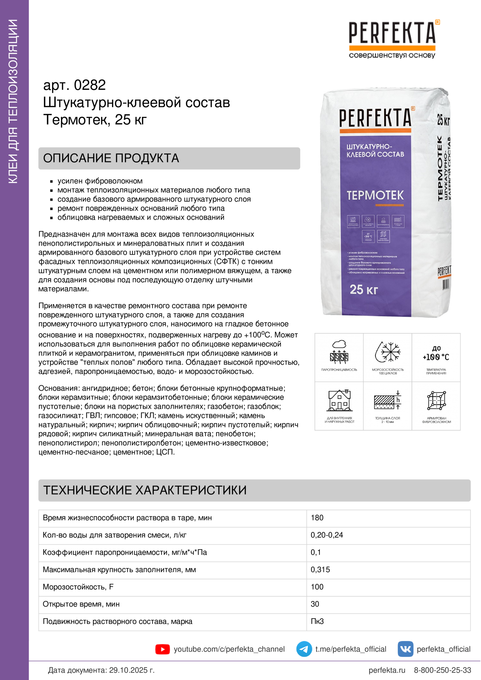 Все рекомендации и технические характеристики верны при температуре окружающей среды +20°С и относительной влажности 60 %. Качество материала гарантируется только при точном соблюдении инструкции производителя по технологии применения и требований СП 293.1325800.2017. Данная инструкция теряет силу после появления новой версии на сайте perfekta.ru.
