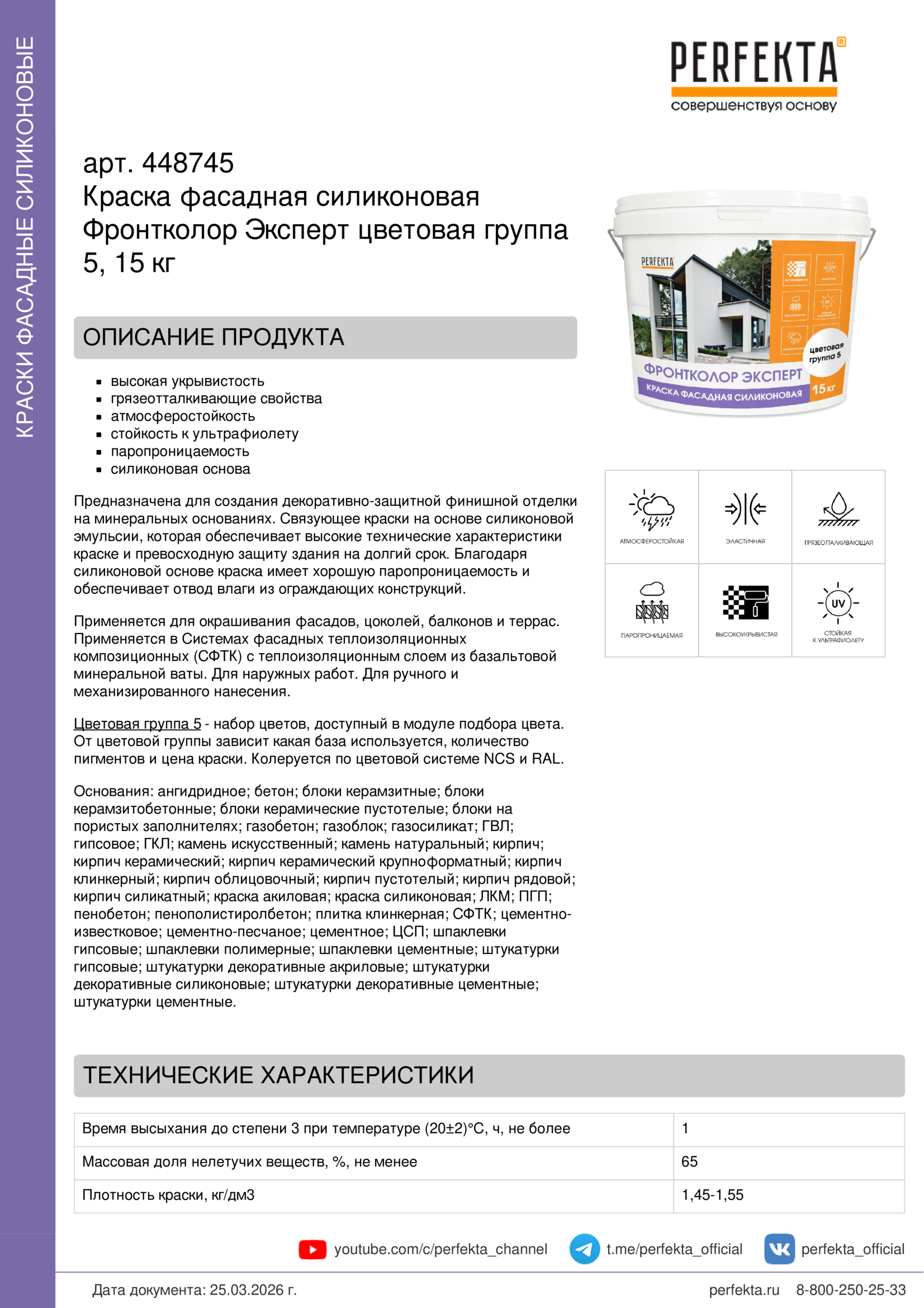 Предназначена для создания декоративно-защитной финишной отделки на минеральных основаниях. Связующее краски на основе силиконовой эмульсии, которая обеспечивает высокие технические характеристики краске и превосходную защиту здания на долгий срок. Благодаря силиконовой основе краска имеет хорошую паропроницаемость и обеспечивает отвод влаги из ограждающих конструкций.