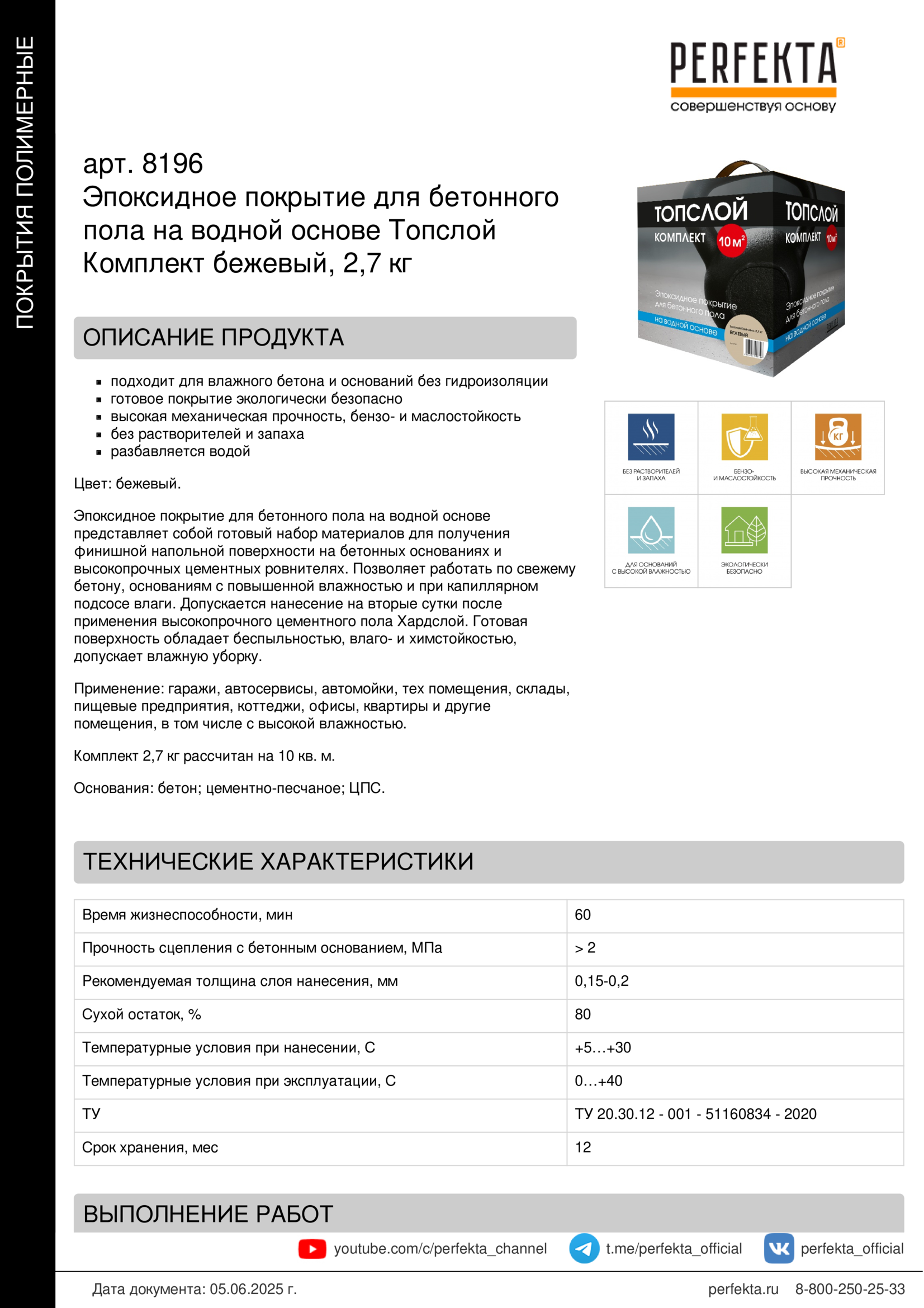 Материал представляет собой двухкомпонентную эпоксидную водоразбавляемую краску, изготовленную на основе низковязкой эпоксидной смолы на бисфенолах A/F, водоразбавляемом циклоалифатическом полиамине с пигментами, наполнителями и функциональными добавками. В затвердевшем состоянии материал экологически безопасен и не оказывает отрицательного воздействия на здоровье человека. Соответствует действующим на территории Российской Федерации гигиеническим нормам.