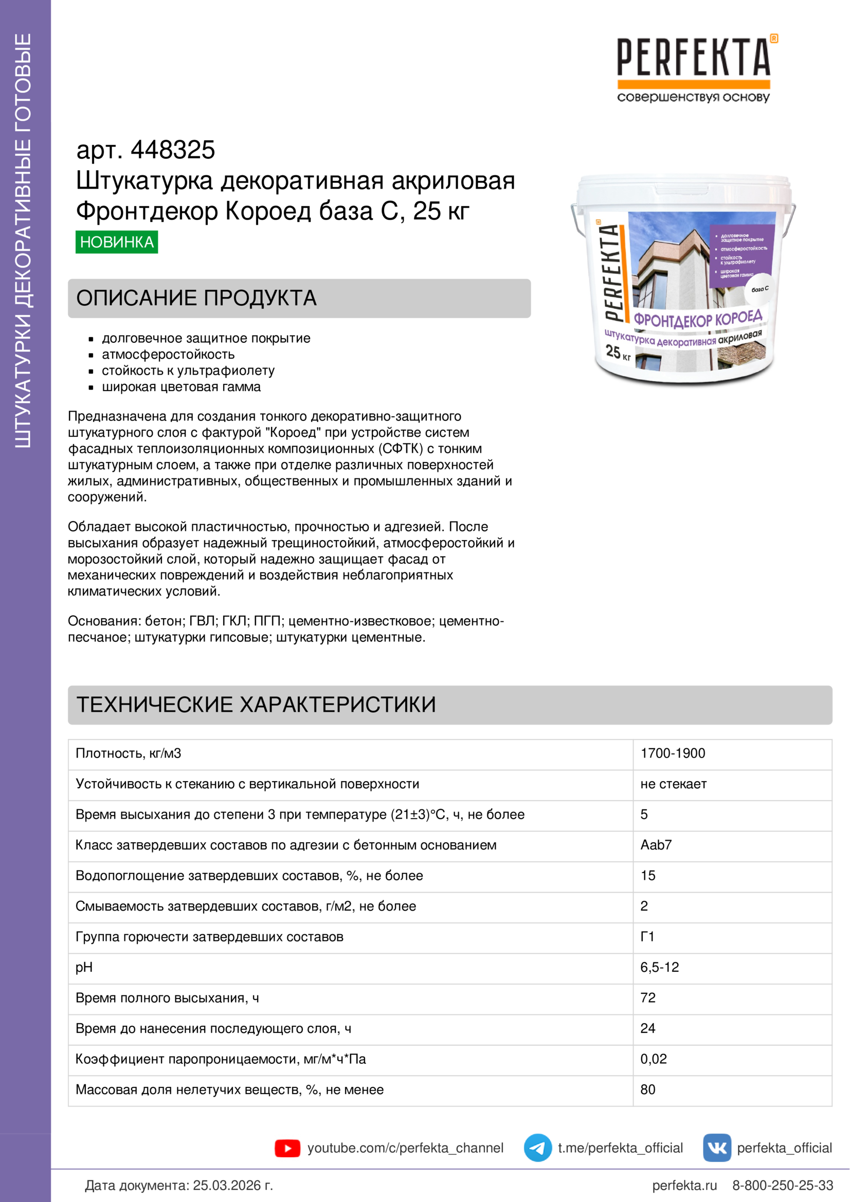 Обладает высокой пластичностью, прочностью и адгезией. После высыхания образует надежный трещиностойкий, атмосферостойкий и морозостойкий слой, который надежно защищает фасад от механических повреждений и воздействия неблагоприятных климатических условий.
