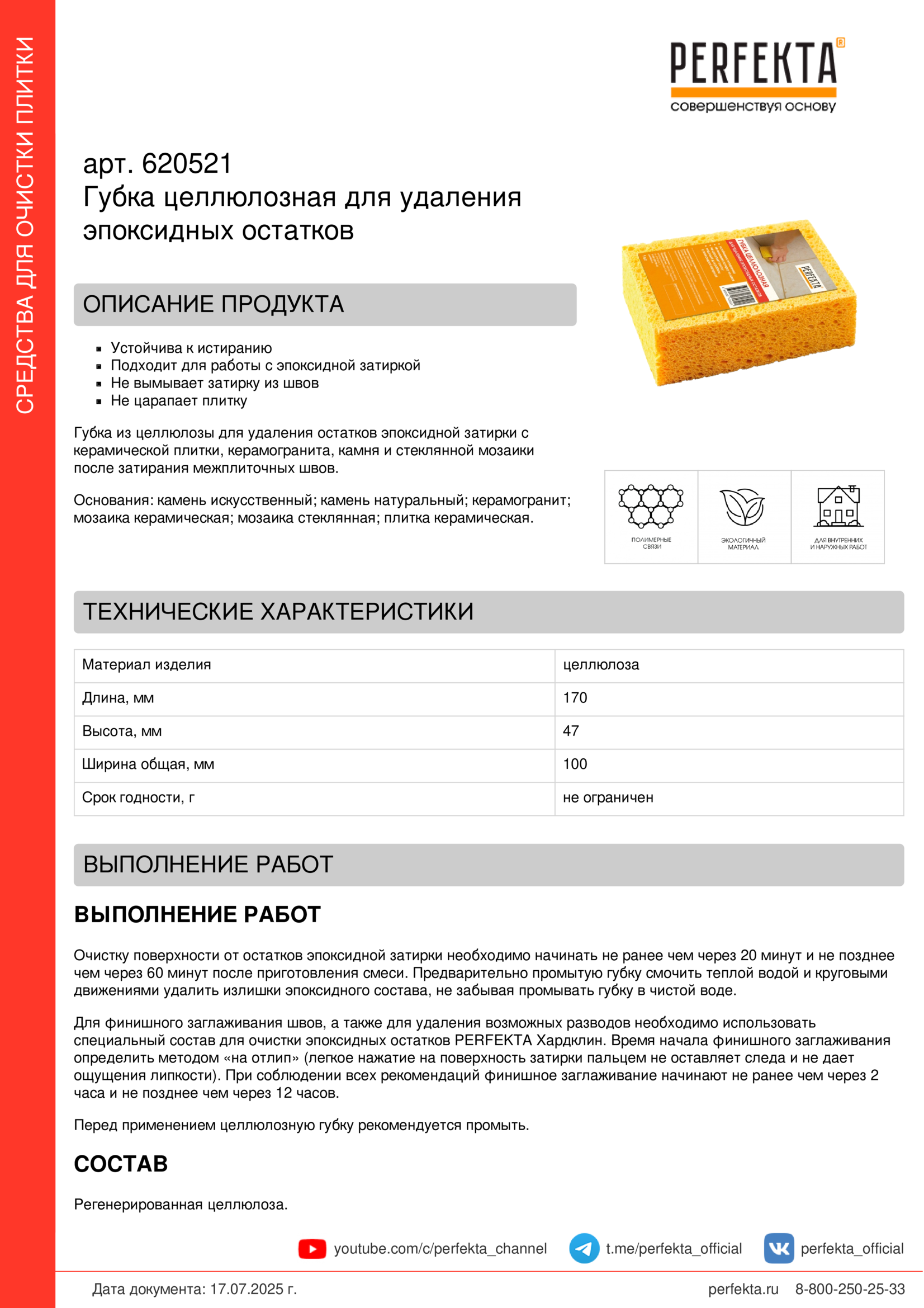 Губка из целлюлозы для удаления остатков эпоксидной затирки с керамической плитки, керамогранита, камня и стеклянной мозаики после затирания межплиточных швов.