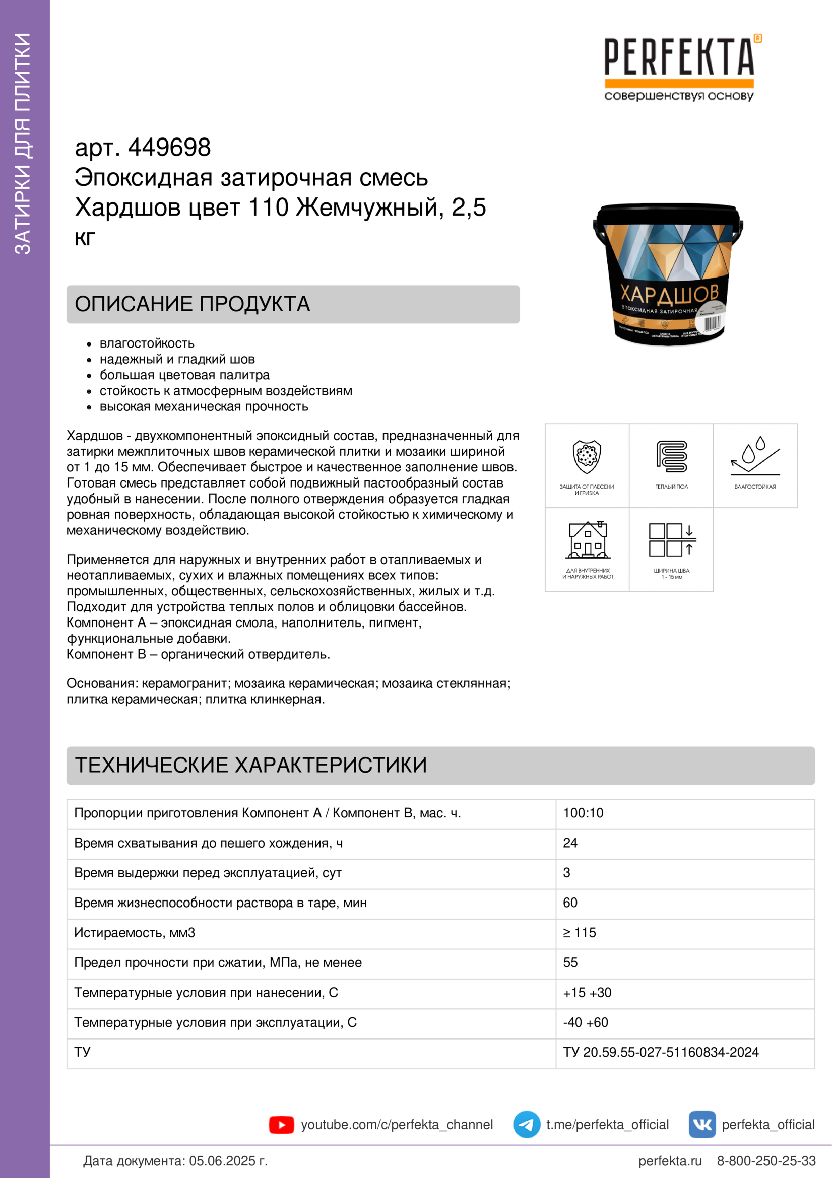 Затирка ХАРДШОВ содержит эпоксидную смолу. Во время приготовления и проведения работ следует использовать защитные перчатки, средства защиты органов дыхания и очки, а также соблюдать стандартные меры предосторожности при обращении с химическими продуктами. При попадании в глаза промыть большим количеством воды и незамедлительно обратиться к врачу. При попадании на кожу, тщательно промыть большим количеством воды с мылом. Беречь от детей.