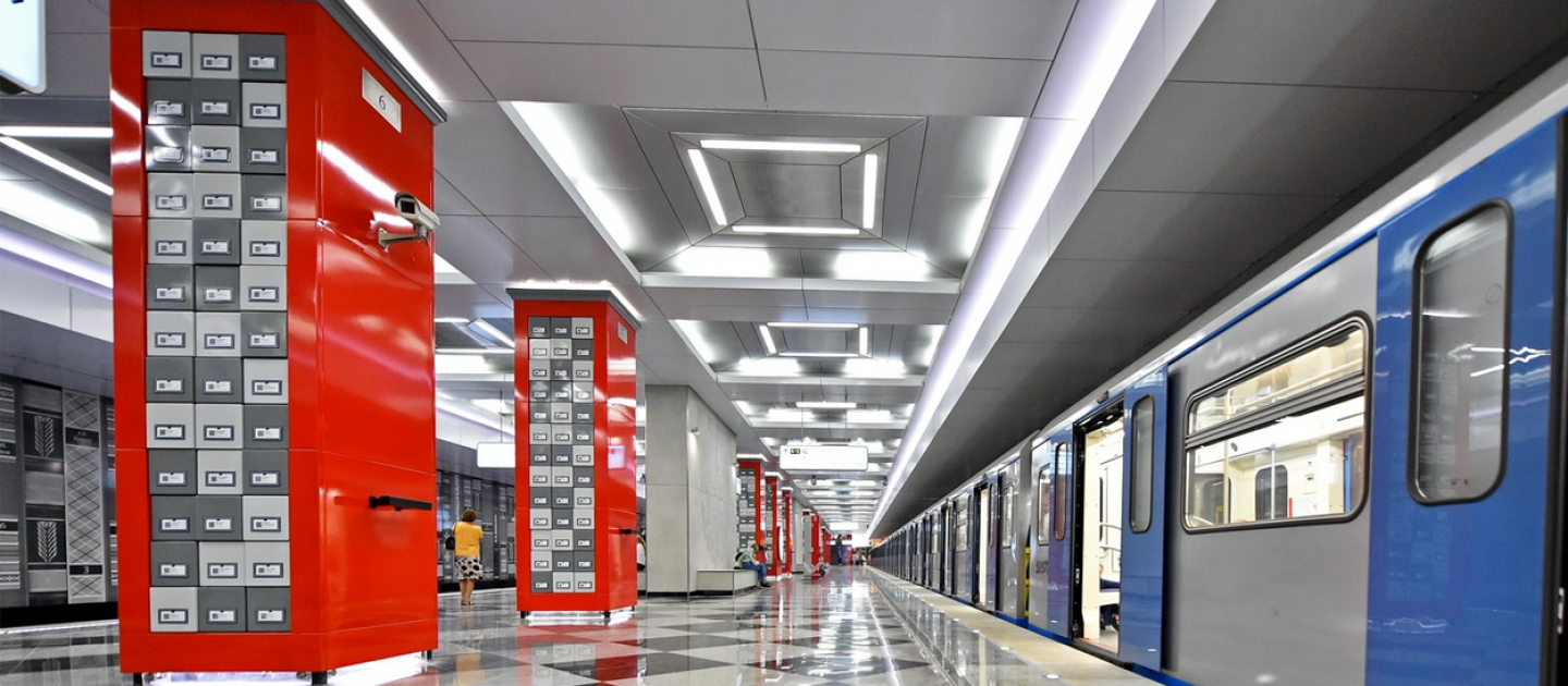 На полу станции уложен гранит всех оттенков серого цвета. На потолке смонтированы светильники-квадраты, а основание колонн и название станции на путевых стенах подсвечивают светодиодные лампы.